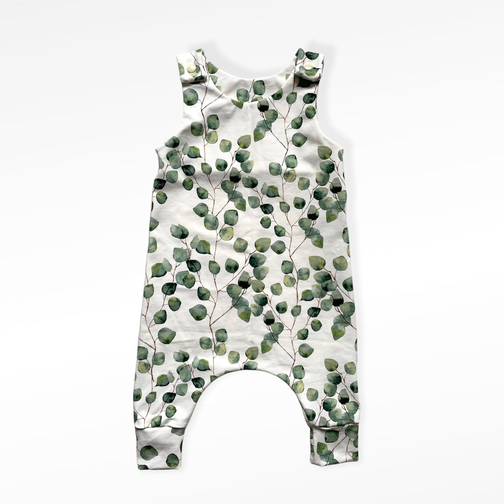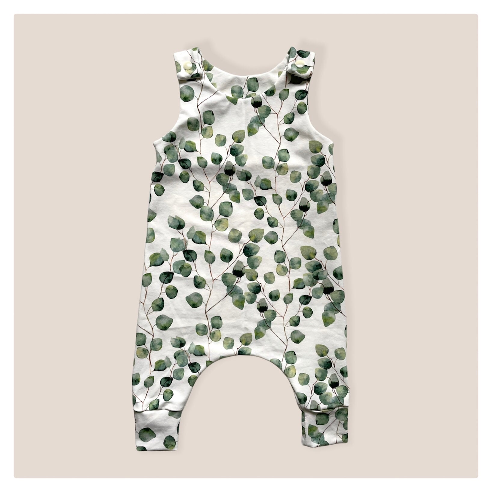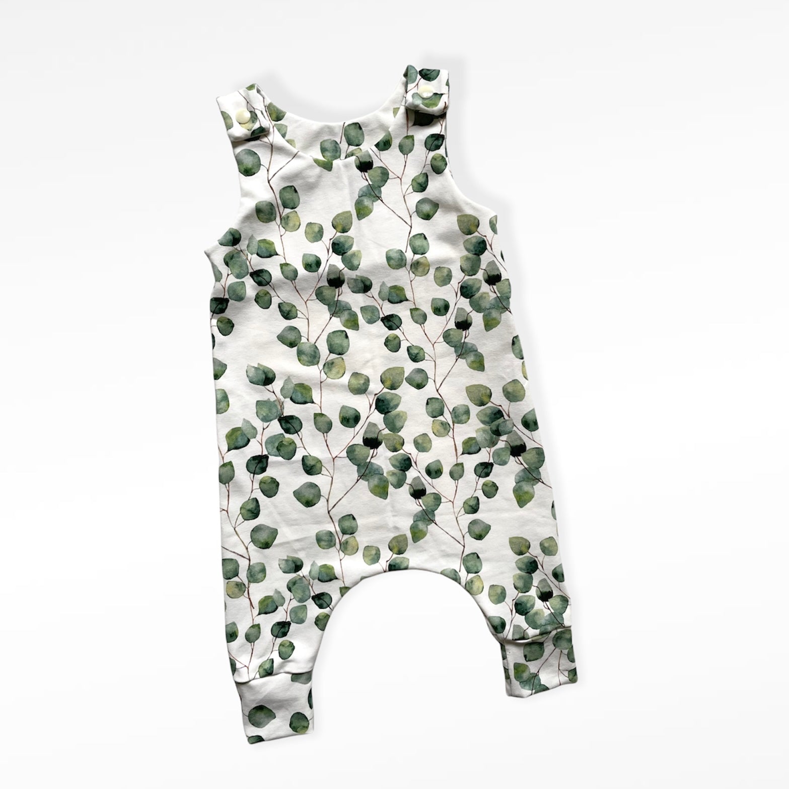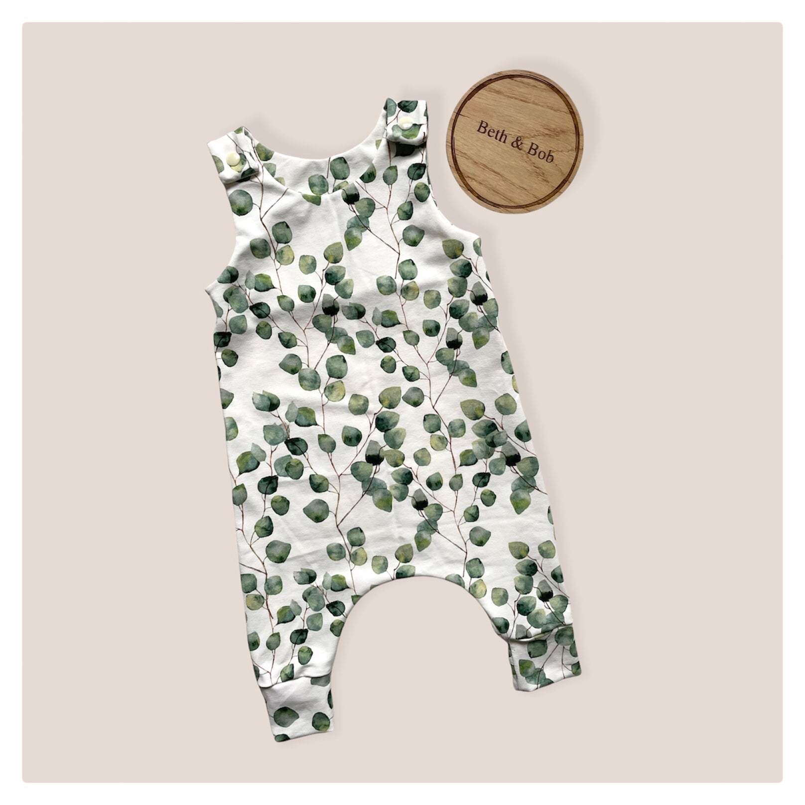 This harem style romper is made from an Organic Jersey Fabric which makes it lovely and comfy, it has poppers on the shoulders for easy fastening, as well as reversible ankle cuffs. The cuffs can be turned up / down as your baby grows, and they are perfect for keeping those little socks on. The seams are over-locked for a quality finish.