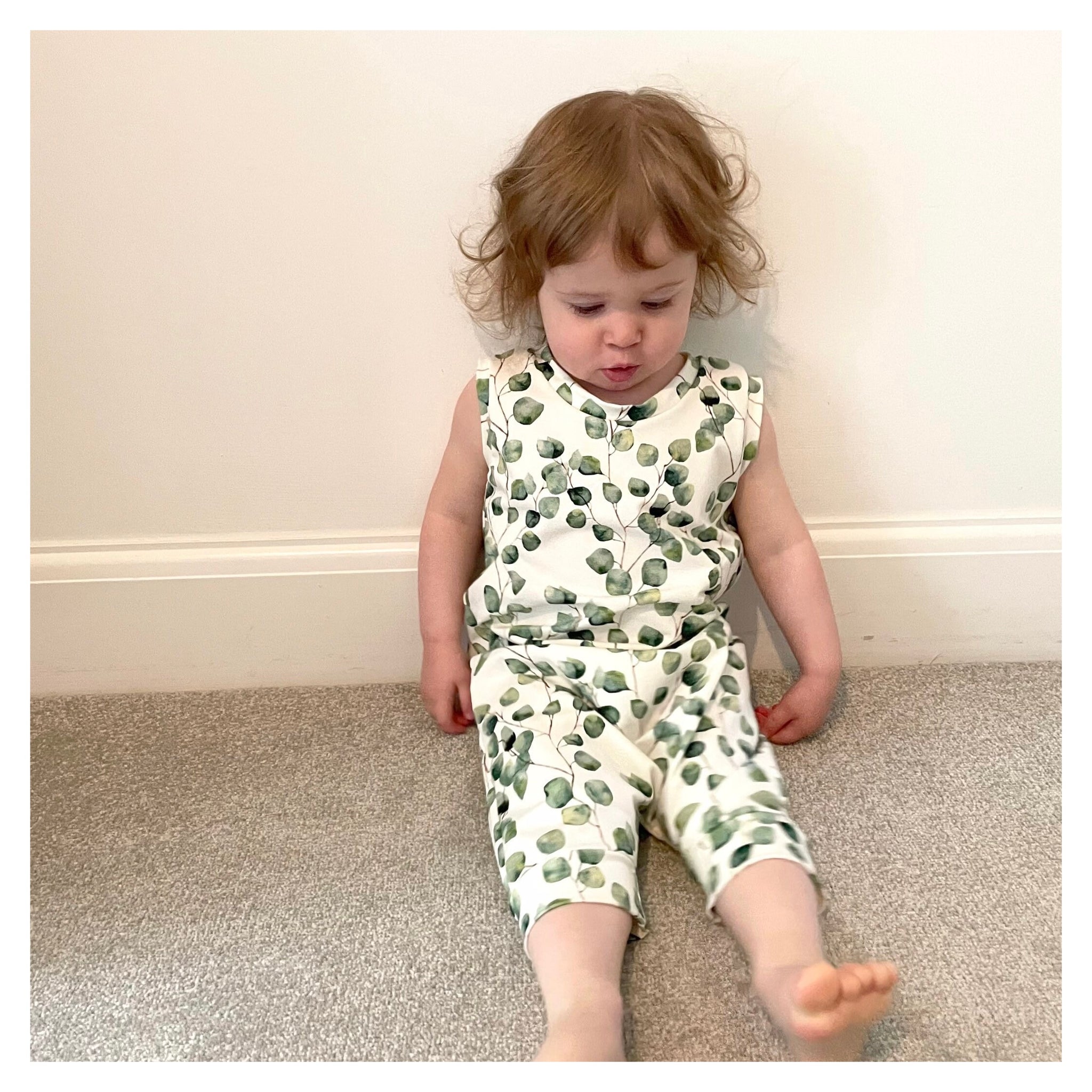 This harem style shortie romper is made from an Organic Jersey Fabric so is lovely and comfy, and it's a pull on style with no poppers which makes it great for quick changes. The seams are over-locked for a quality finish.
