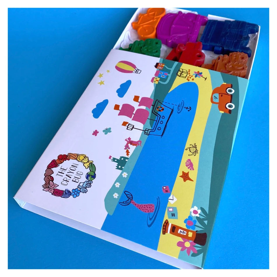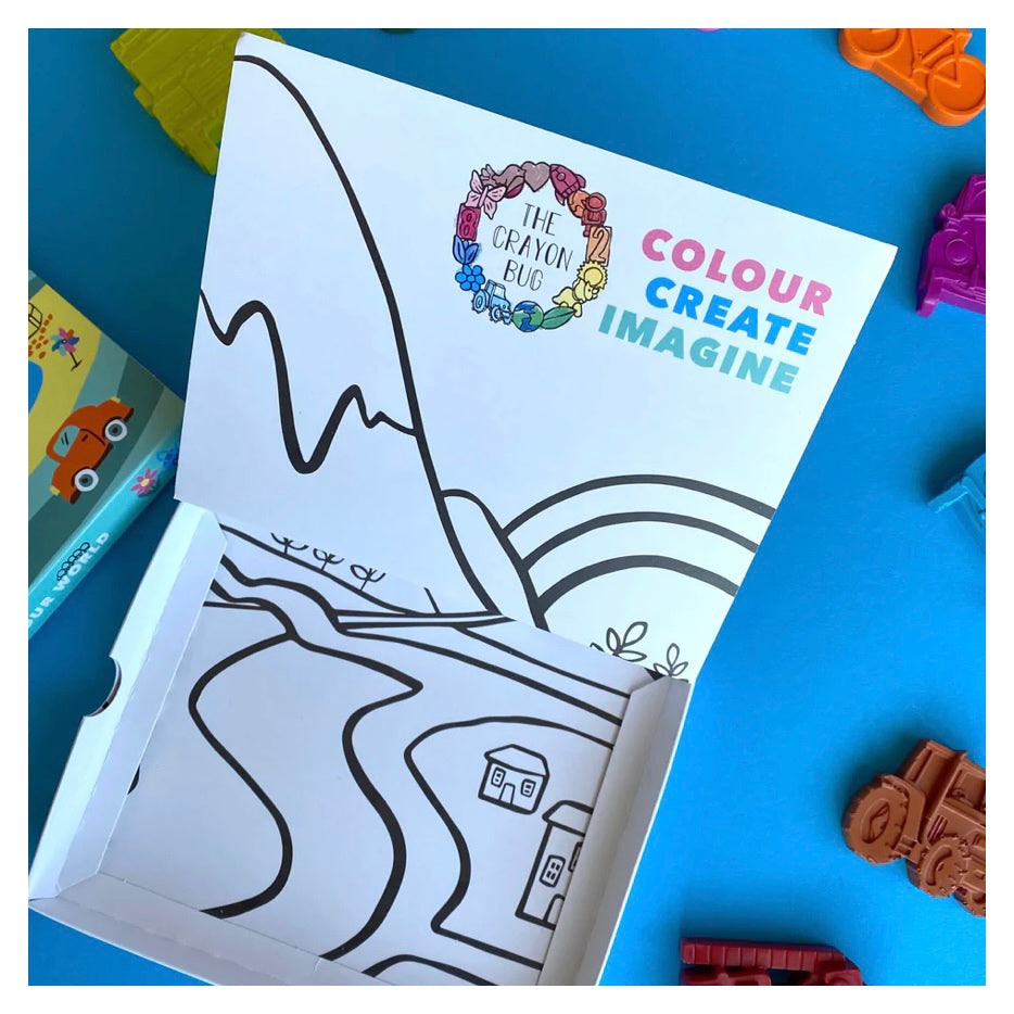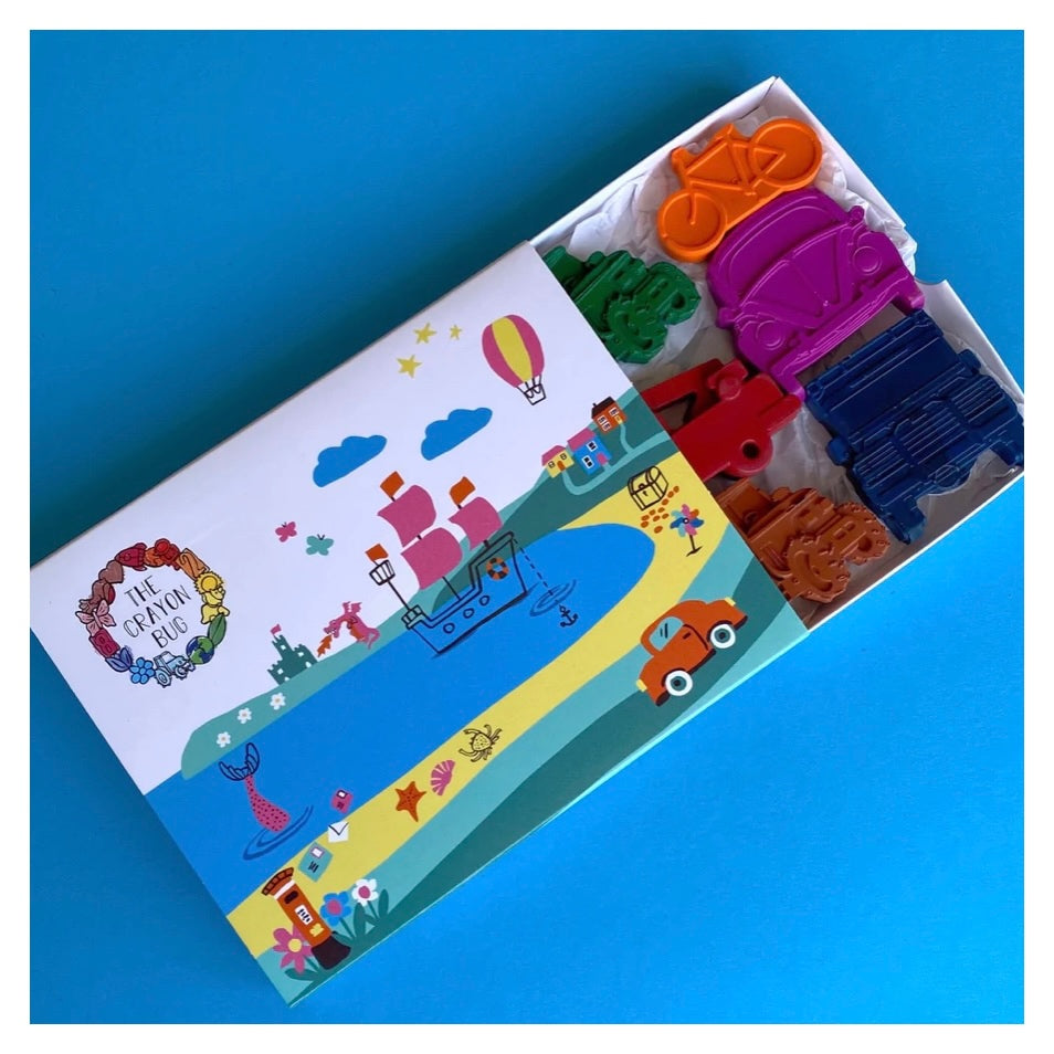 Each box is filled with nine vehicle shaped crayons of differing colours, layered carefully with tissue paper so they arrive with you as perfectly as they leave our studio. These crayons are handmade so colours may vary slightly from the photo shown.
